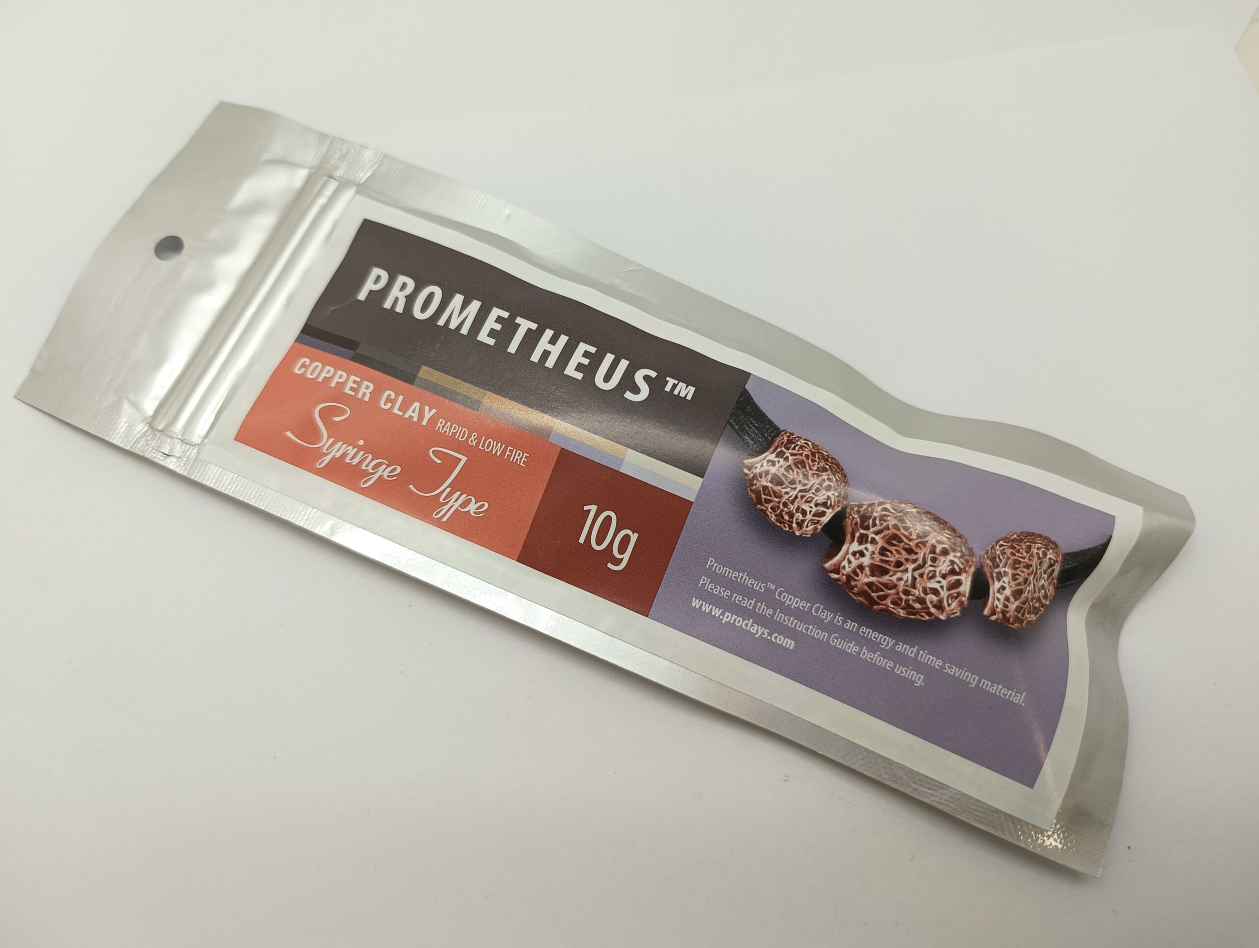 Prometheus Copper Clay w strzykawce, zaopatrzonej w w komplet końcówek (średnice otworu: 0,41; 0,84; i 1,19mm). Ta forma opper Clay daje możliwość tworzenia delikatnych okrągłych „drutopodobnych” wzorów na powierzchni oraz do tworzenia form ażurowych, np. na korku. Więcej informacji na temat Prometheus Copper Clay znajdziesz w opisie Prometheus Copper Clay blok 50g.