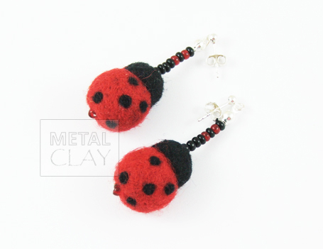 Potrzebne materiały: wełna do filcowania w kolorze czerwonym i czarnym, linka jubilerska (2 odcinki po ok. 10 cm), koraliki szklane w kolorze czerwonym (6 sztuk) i czarnym (12 sztuk), kulki zaciskowe, łapaczki, sztyfty, baranki (po 2 sztuki);