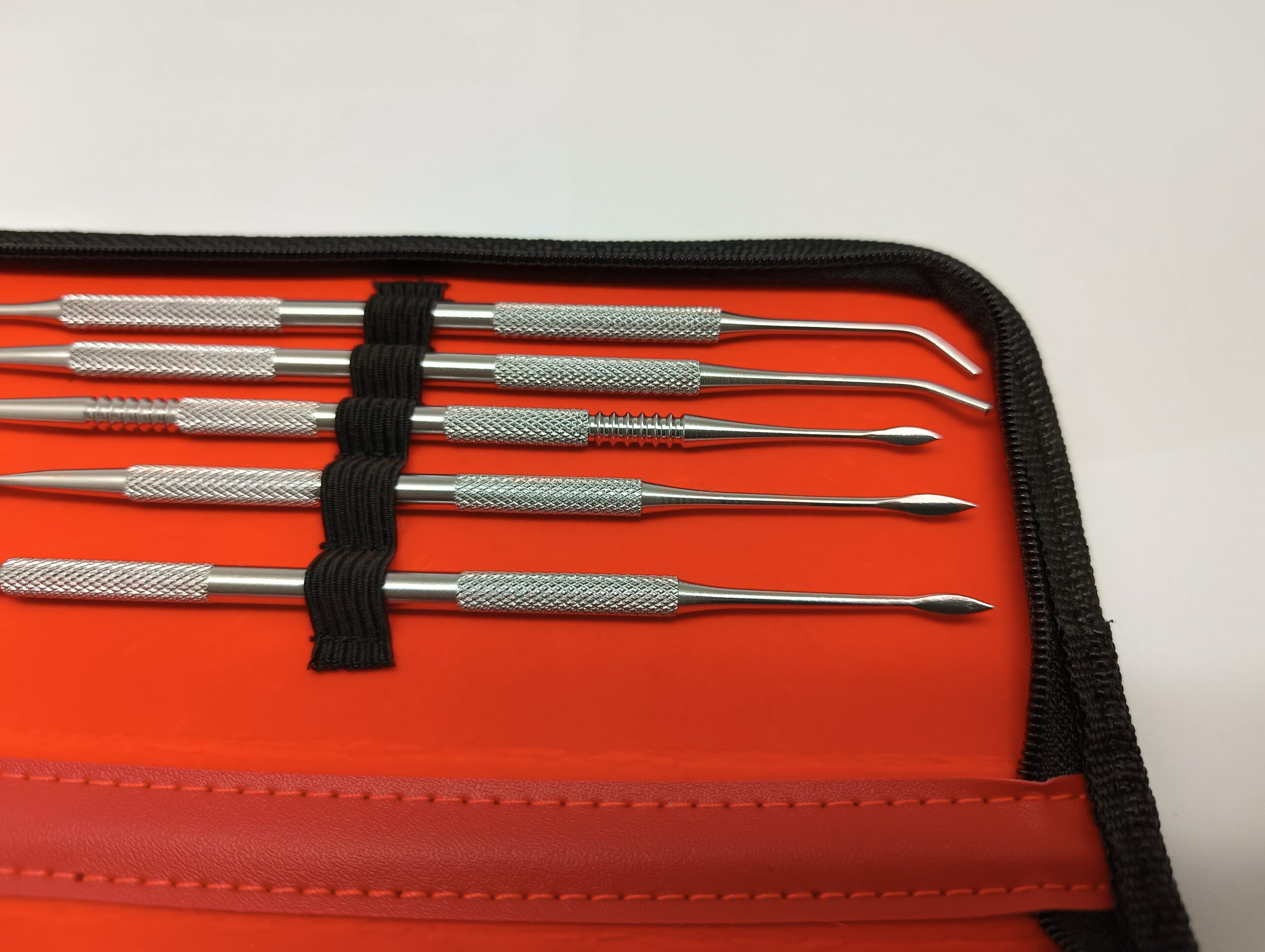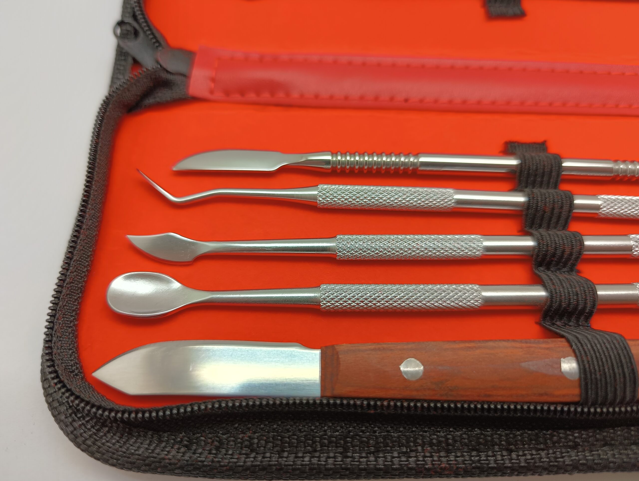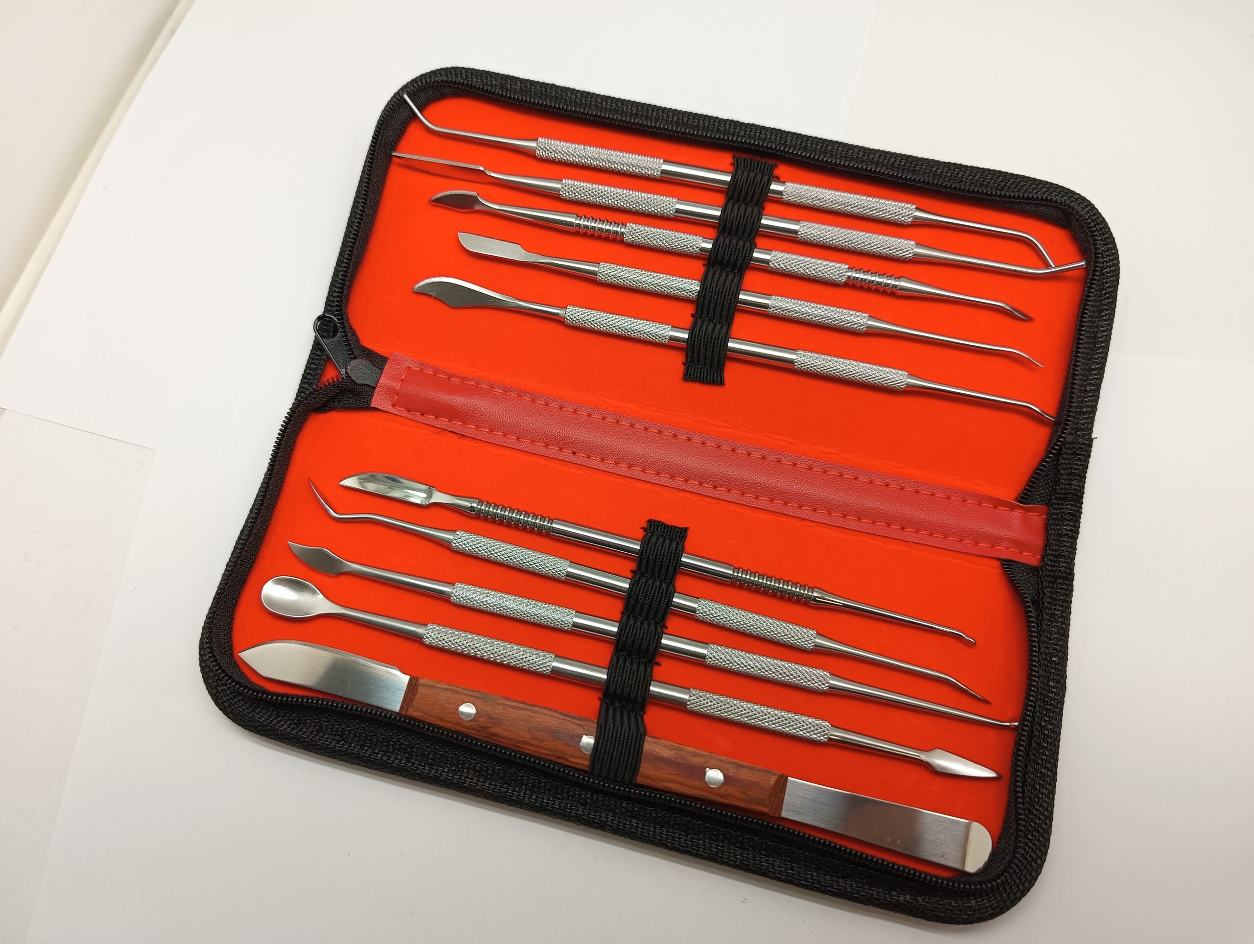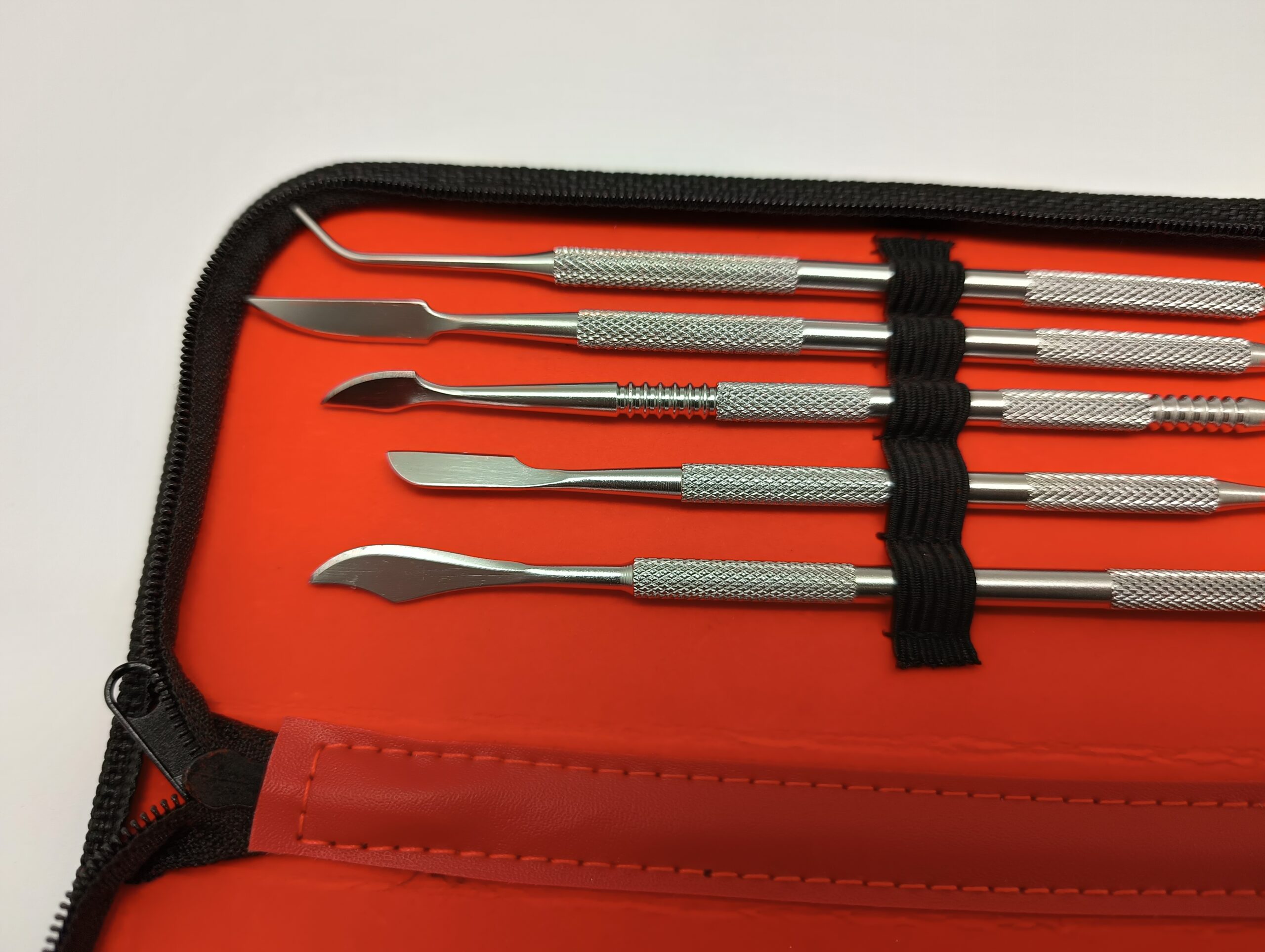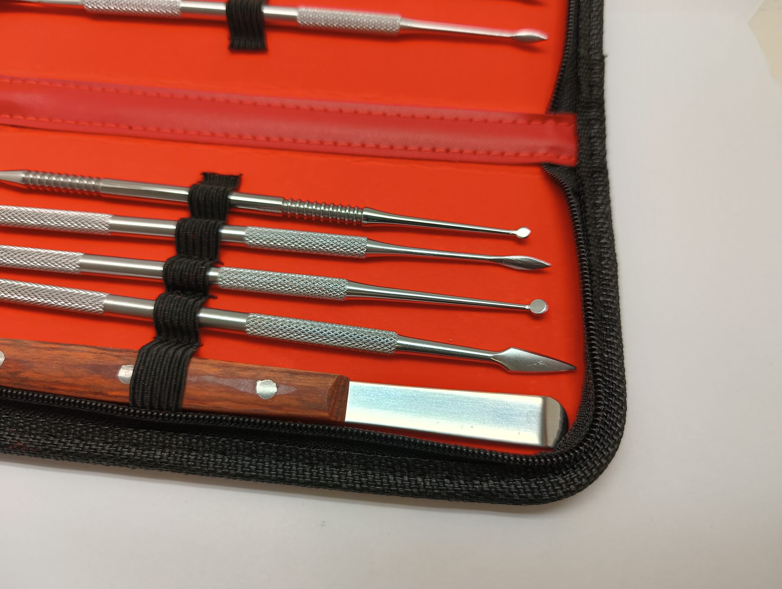 Zestaw 10 stalowych szpatułek do modelowania, w etui. Przydatne do pracy z woskiem, gliną i modeliną oraz Art Clay i innymi glinkami metali – zarówno na etapie mokrym jak i suchym. Przydatne również do pracy z Fimo.