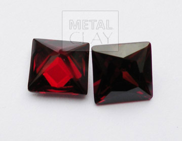 Cyrkonia kwadratowa, wielkość 8x8mm, kolor garnet. Można wypalać razem z produktami Art Clay, Bronz Clay itp. lub oprawiać w oprawy do cyrkonii (p. dodatki 999) lub w srebro i inne metale.