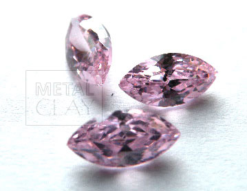 Cyrkonia typu „markiza”, wielkość 8 x 4 mm, kolor różowy. Można wypalać razem z produktami Art Clay, Bronz Clay itp. lub oprawiać w oprawy do cyrkonii (p. dodatki 999) lub w srebro i inne metale.