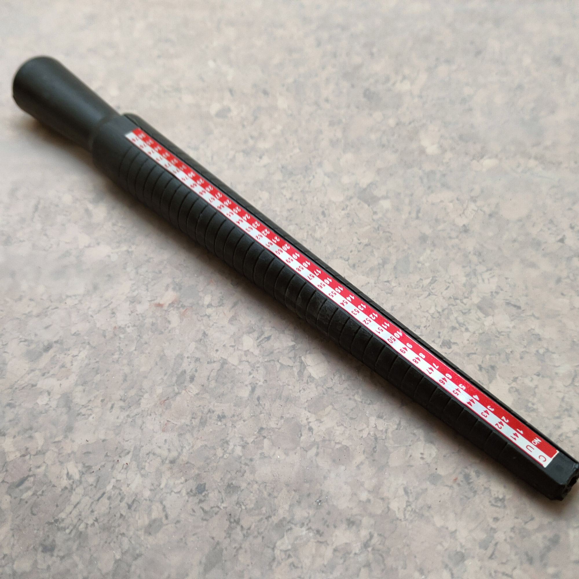 Trzpień miarowy, plastikowy. Służy do sprawdzania rozmiaru wykonywanego pierścionka. Skala w milimetrach (13-24), US (1-15), No (1-36), CU (41-76).