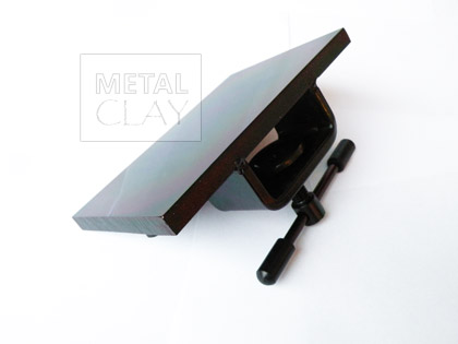 Stalowy, lakierowany na czarno uchwyt na klin drewniany, mocowany do stołu na 2 śruby. Uchwyt zaopatrzony jest w stalową płytę, która może służyć za kowadło.